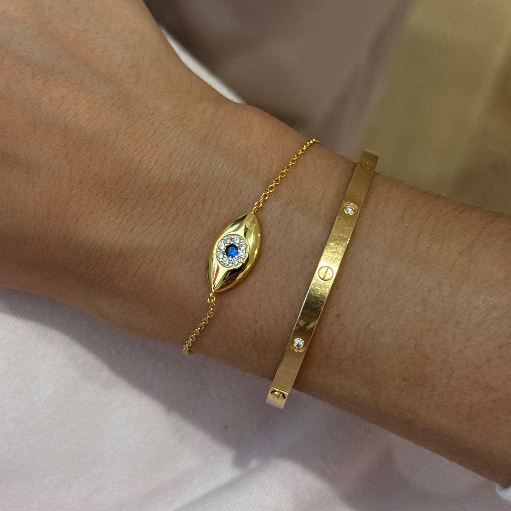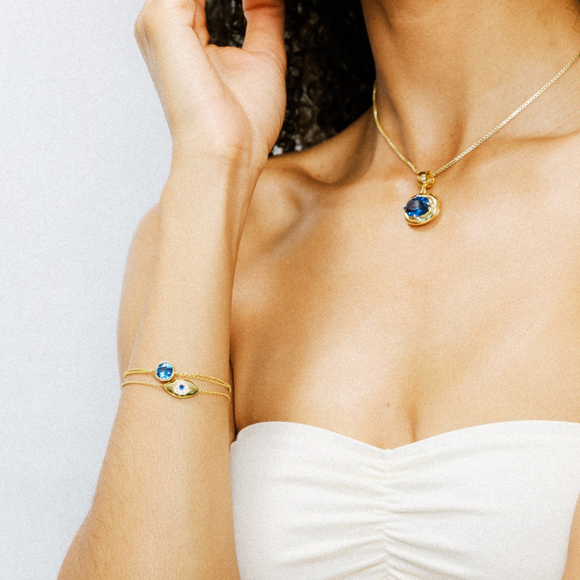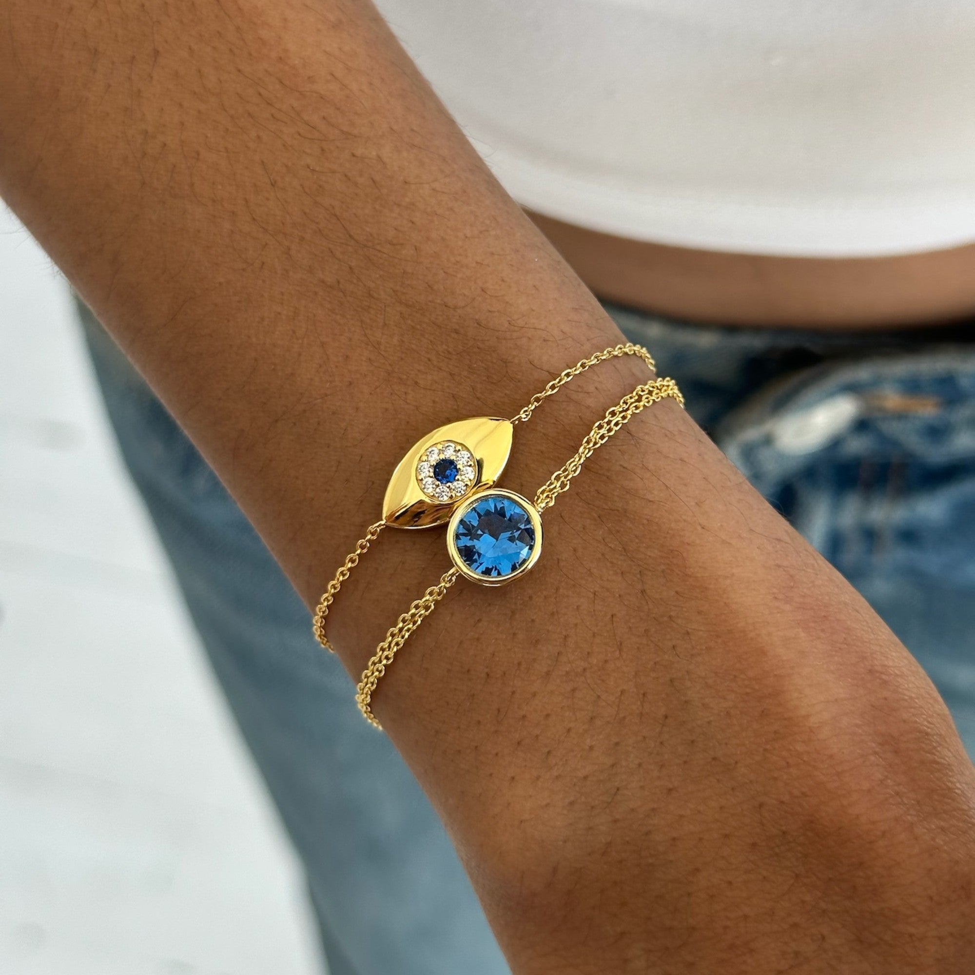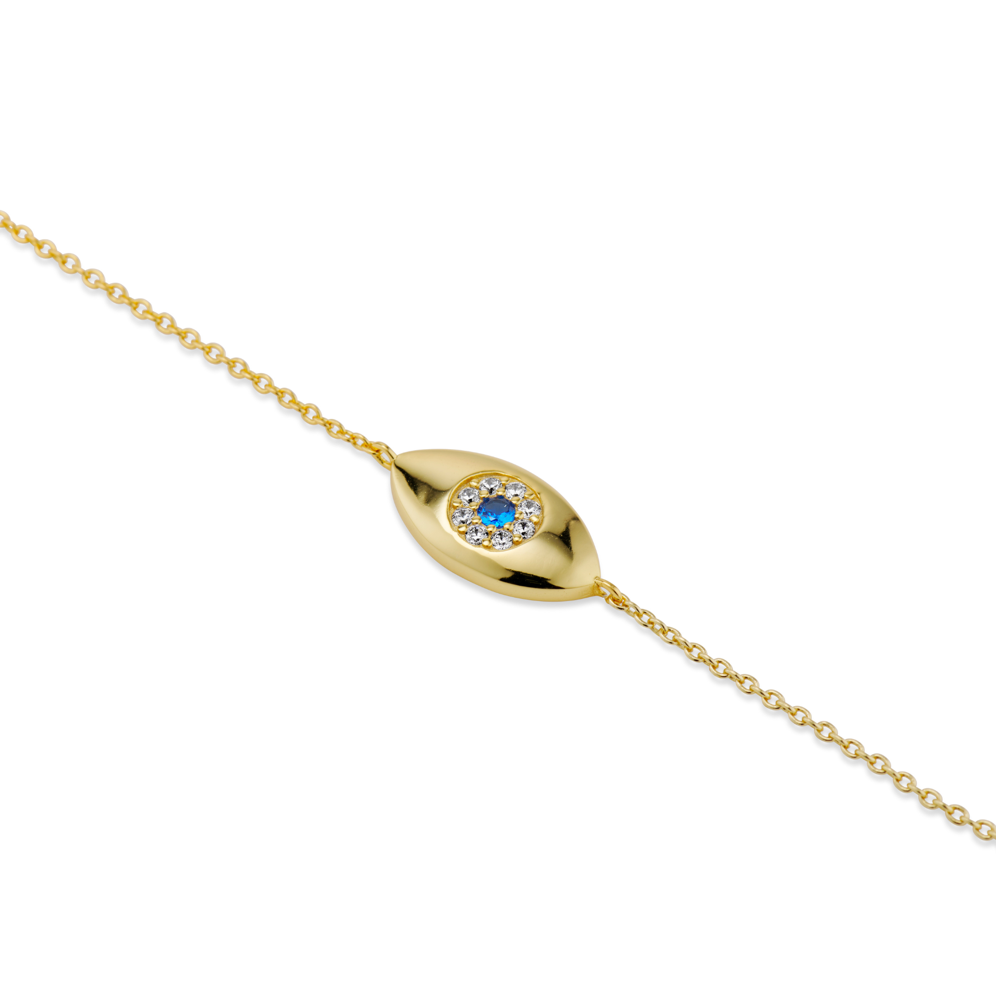 The Evil Eye Bracelet from epjewels.com features a stunning design adorned with sparkling cubic zirconia, delicately strung on a fine gold chain. Its adjustable clasp ensures a perfect fit, allowing you to wear it comfortably throughout the day. This versatile piece is designed to bring both style and protection to your everyday!
