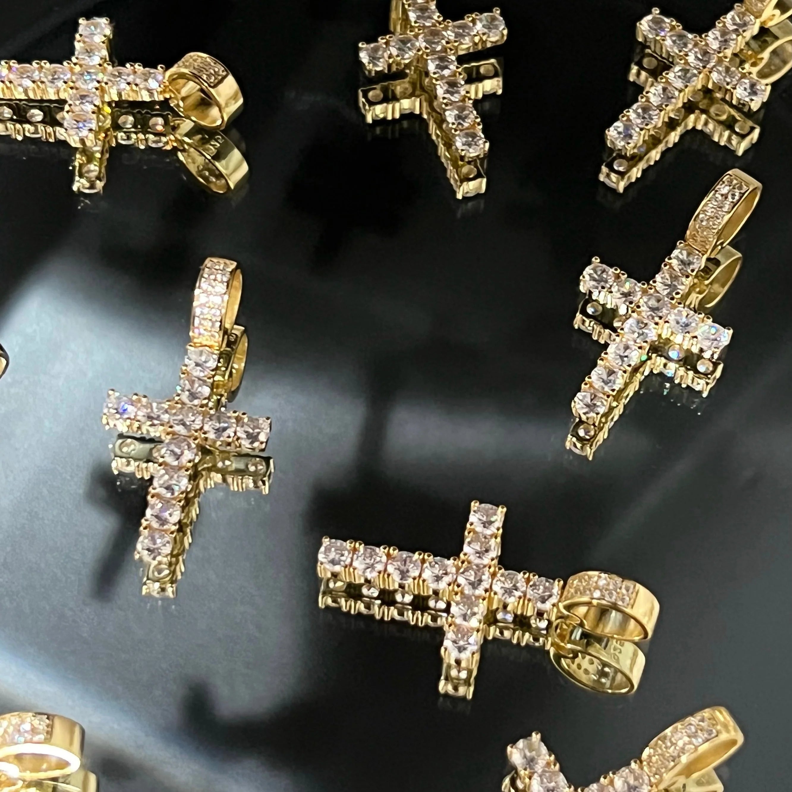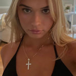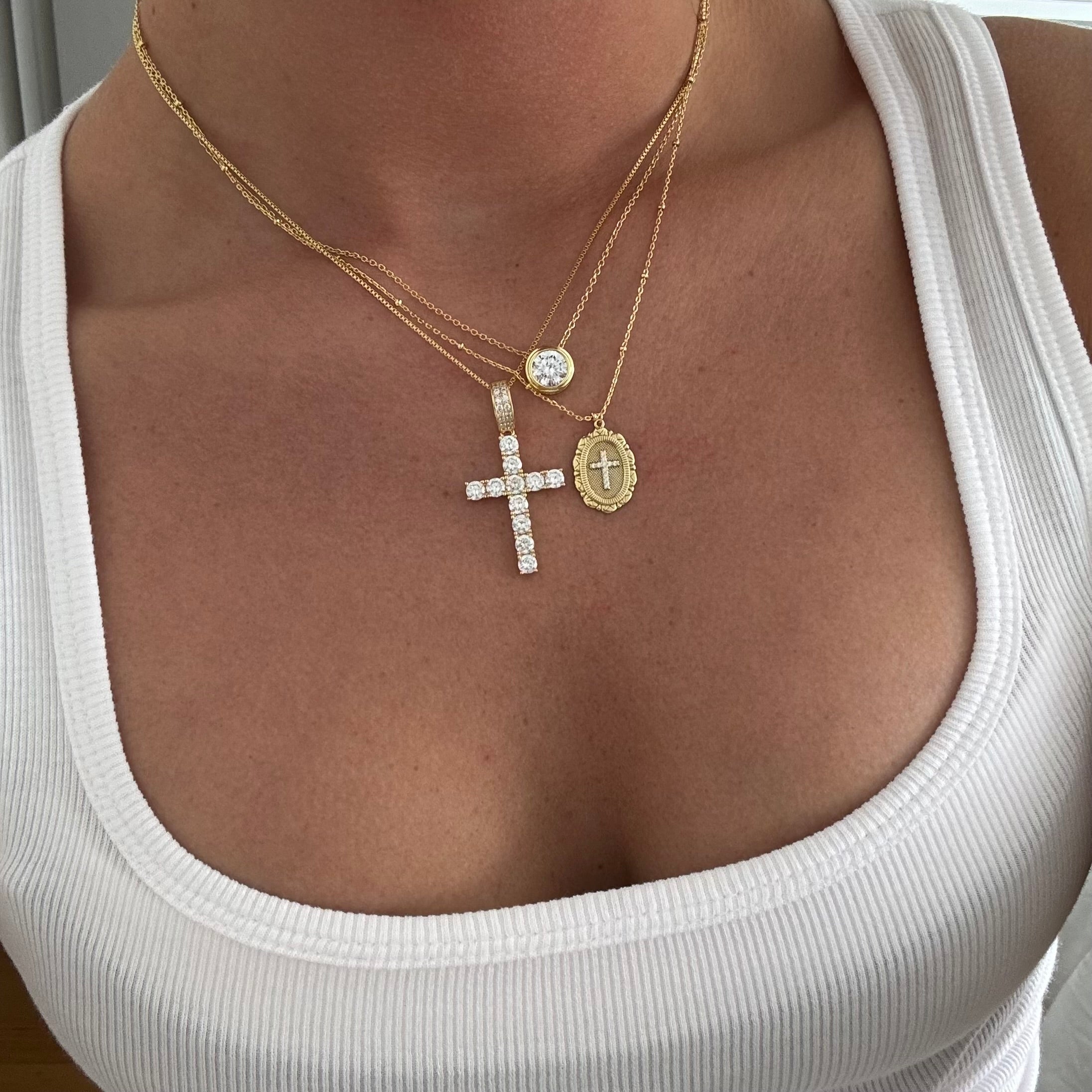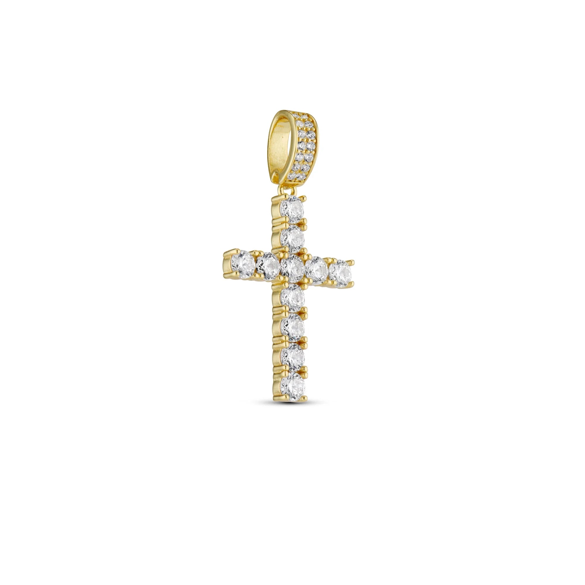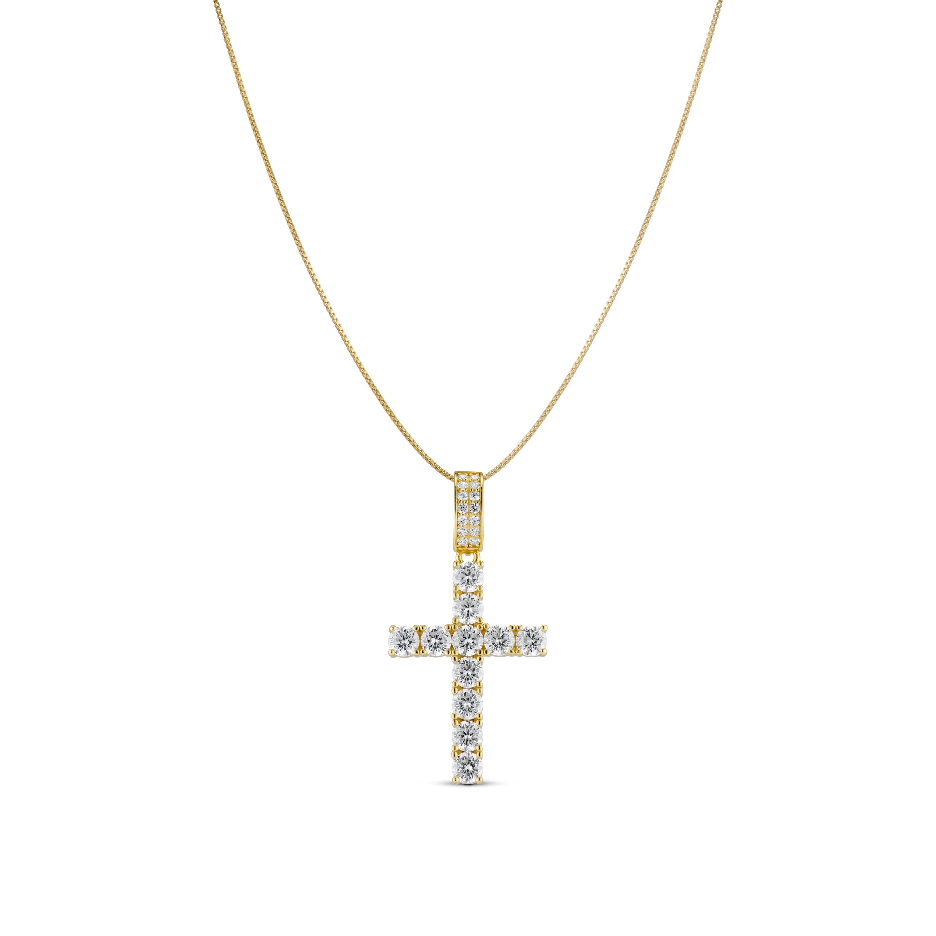 The Cross Necklace is a popular and highly sought-after piece of jewelry at epjewels.com. It features beautiful CZ stones that resemble real diamonds, giving it a stunning and sophisticated look. This necklace is made with sterling silver and is available in both 14k gold plating and rhodium plating. This pendant serves as a symbol of faith and spirituality, making it a meaningful and cherished piece for many. Whether you're dressing up for a special occasion or looking to add a touch of glamour to your everyday attire, this necklace is sure to make a statement and be admired by others.