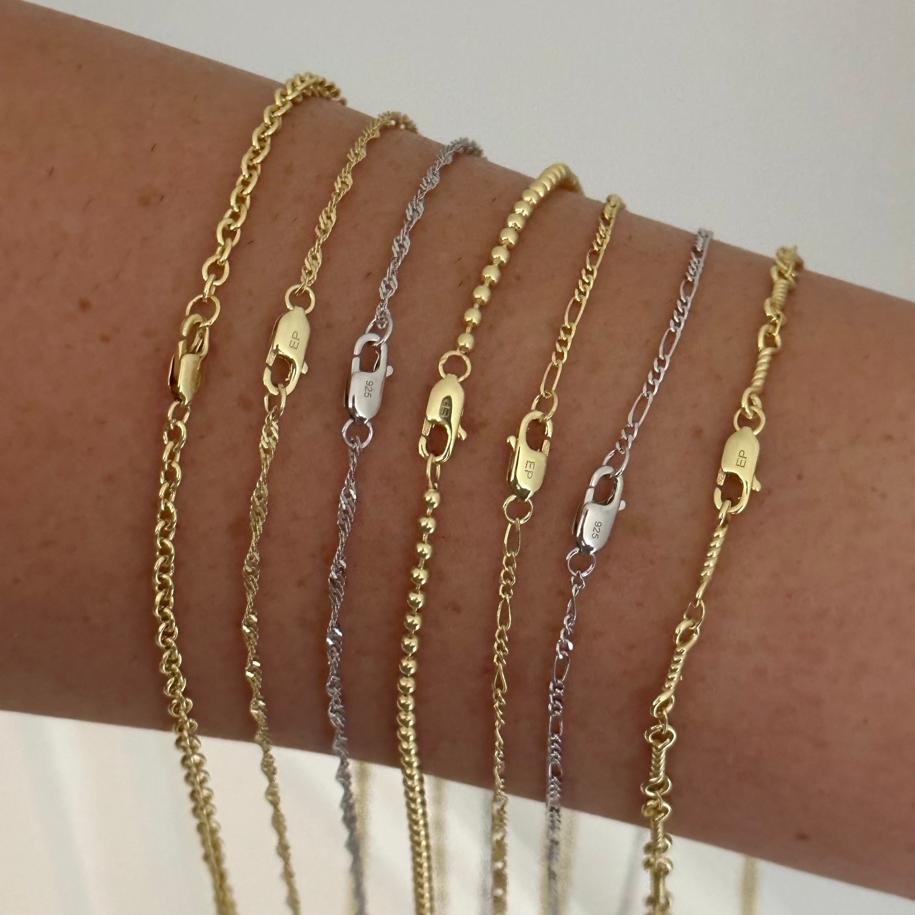 The Dainty Chain in sterling silver with a 14k gold plated finish is perfect for adding a touch of elegance and charm to your jewelry collection. The unique and simple design allows it to be worn alone as a delicate and understated necklace, or it can serve as a foundation for stacking with other chains of different lengths to create a layered and trendy look. The versatility of this chain also makes it ideal for showcasing pendants or charms, allowing you to personalize your necklace and add your own touch of style. Whether you prefer a minimalist pendant or something more eye-catching, this epjewels.com chain provides a beautiful backdrop to highlight your chosen piece. With its sterling silver construction and 14k gold plated finish, this chain offers both durability and a luxurious aesthetic. Its timeless design ensures that it will remain a staple in your jewelry collection for years to come. So, whether you want to wear it on its own, stack it with other chains, or showcase a favorite pendant, this dainty chain is the perfect accessory to enhance your style. CHAIN OPTIONS :