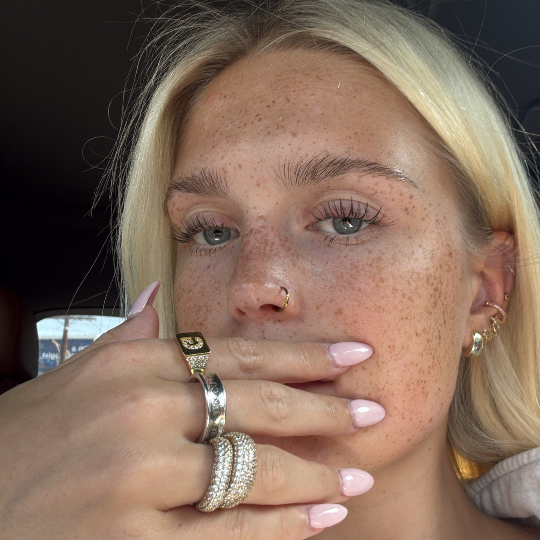 A refined update to our original Kaete Ring, the Iced Kaete Pinky Ring features a slimmer, more delicate design with full pave shine. It keeps the same structured Kaete look you love, just softer and perfectly sized for the pinky. Classy, sparkly, and made for stacking with all your everyday rings from epjewels.com